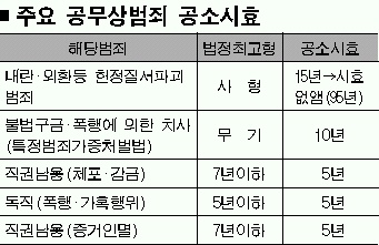 국가기관(또는 국가기관의 구성원)이 정당한 이유없이 살인 또는 고문을 하거나 관련 사실을 은폐했을 경우, 처벌할 수 있는 조항들이다. 이 범죄들의 공소시효는 최단 3년에서 최장 15년. 이 가운데 내란·외환죄와 집단살해죄 등의 공소시효는 15년이었지만 1995년에 제정된 ‘헌정질서파괴범죄 공소시효 특례법’에 의해 공소시효가 배제됐다. 고문이나 그 사실을 은폐했어도 5년이 지나면 처벌할 수 없다.