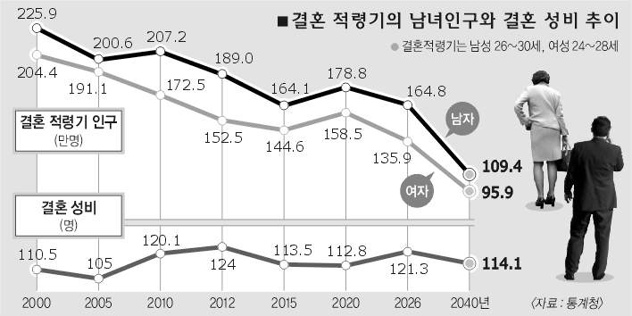 하지만 2010년에 결혼할 경우 남성은 207만 2000명, 여성은 172만 5000명으로 여성이 34만 7000명이나 부족하다.2011년에는 38만 5000명,2012년에는 36만 5000명의 여성이 남성보다 적을 전망이다.