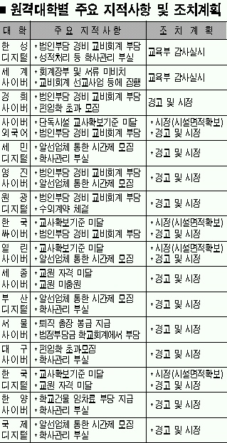 열린사이버대와 한국싸이버대, 한국디지털대, 사이버외대 등 4곳은 인가 기준을 지키지 않다가 적발됐다. 교육부는 이 대학들에 1년 안에 시정할 것을 요구하고 이를 지키지 않으면 인가를 취소하기로 했다. 이와 함께 교비 횡령·유용 의혹이 있는 한성디지털대 등 두 곳에 대해 심층 감사를 실시하고, 알선업체를 통해 학생을 모집한 6곳 등 모두 7곳은 경찰에 자료를 넘기기로 했다.