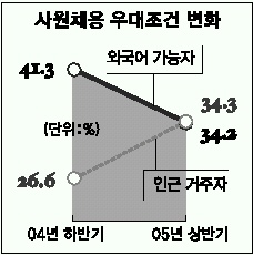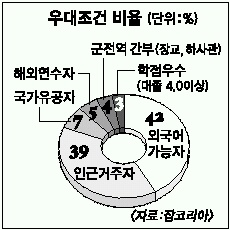 하지만 인근지역 거주자에 대한 기업의 선호도는 올 들어 큰 폭으로 늘었다. 지난해 9∼12월 분석에서는 인근 거주자 우대 비율이 26.3%에 불과했으나 올해에는 5%포인트 가량 늘어났다. 반면 외국어 우수자에 대한 우대는 지난해 39.1%에서 올해에는 4%포인트 남짓 떨어졌다. 이밖에 올해 국가유공자에 대한 우대는 5.5%(지난해 4.6%), 해외연수자 4.0%(4.4%), 군 전역간부 2.1%(3.0%), 학점우수자 2.1%(2.2%)로 각각 지난해와 비슷했다.