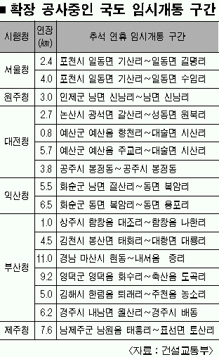 건교부는 추석연휴 원활한 교통소통을 위해 경부선 한남대교∼반포IC(2.4㎞) 6차로 확장구간과 동대구∼경산IC(9.5㎞) 8차로 확장구간을 당초 계획보다 3개월 앞당겨 오는 15일 개통키로 했다. 또한 국도 확장공사 구간 중 경기도 포천 일동 기산리∼길명리 등 16개 구간 78.9㎞도 16일 0시부터 20일 자정까지 5일간 임시 개통된다.
