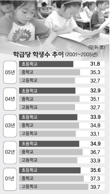 초등학교의 경우 학급당 학생 수가 2001년에 35.6명이었으나 2002년 34.9명을 시작으로 2003년 33.9명,2004년 32.9명에 이어 2005년엔 31.8명으로 뚝 떨어졌다.