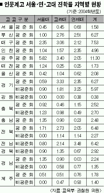 2004학년도 대학입시에서 일반 고등학교의 서울대와 연세대, 고려대 진학률이 전국에서 가장 높은 지역은 광주인 것으로 나타났다.