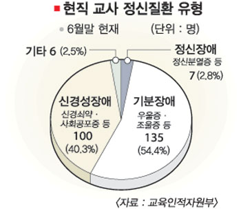 국회 교육위원회 소속 한나라당 이주호 의원은 22일 전국 국공립 및 사립학교 교사의 정신적 질병 실태를 조사한 교육인적자원부의 자료를 공개했다.