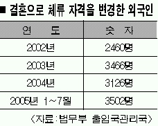 내국인과 결혼해 체류자격을 변경한 외국인은 2002년 2460명,2003년 3466명, 지난해 3126명 규모였으나 올해에는 1∼7월에만 3502명으로 지난해 수준을 이미 크게 넘어섰다.