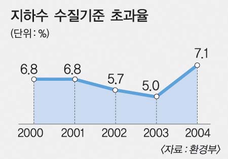 환경부가 실시한 지난해 지하수 수질측정결과에 따르면 조사 대상 3865개 중 212개가 수질기준을 초과했다. 공단지역·매립지지역·폐광주변 등 오염우려지역에서는 기준 초과 비율이 7.1%를 기록, 전년도 5.0%보다 2.1%포인트 증가하는 등 오염이 늘고 있다. 특히 폐기물 매립지역, 골프장, 분뇨처리장 인근지역이 수질기준 초과 비율이 높았다.
