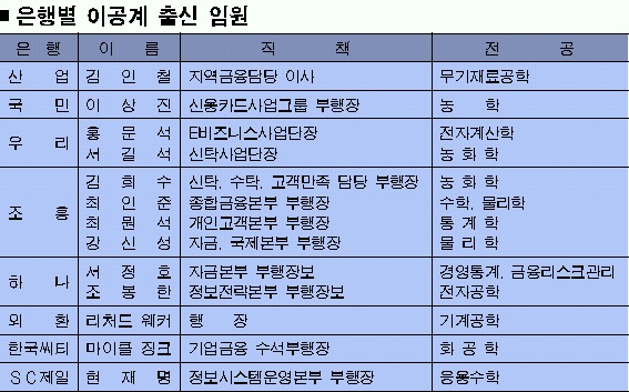 금융권의 대표적인 정보기술(IT)전문가로 꼽히는 SC제일은행의 현재명(응용수학) 부행장은 은행의 정보시스템을 총괄하고 있다. 조흥은행에는 김희수(농화학) 부행장, 최인준(수학·물리학) 부행장, 최원석(통계학) 부행장, 강신성(물리학) 부행장 등 4명의 이공계 출신이 임원진에 포진해 있다. 하나은행의 서정호 부행장보와 조봉한 부행장보는 미국에서 공학박사 학위를 받았다. 외환은행의 리처드 웨커 행장도 미주리공대에서 기계공학을 전공했다.