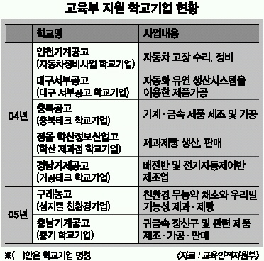 서울지역 고등학교로는 처음으로 서울영상고와 서서울생활과학고, 성동여실고, 서울공고, 용산공고, 도봉정보산업고 등 ‘학교기업’ 6곳이 설립된다고 서울시교육청이 17일 밝혔다. 학교기업이란 실업고 학생들의 현장실습과 효과적인 사회 진출을 돕기 위해 정부의 지원을 받아 운영하는 교내 기업으로, 지난해 처음 도입됐다. 현재 교육인적자원부가 지원하는 7곳을 비롯, 각 시·도교육청이 지원하는 학교기업 등 전국에 10여곳이 있다. 학교기업은 학교가 사업자가 돼 교과과정과 연계된 사업을 계획하고, 교육당국으로부터 사업자금을 지원받는다는 점에서 창업동아리 등을 통한 ‘고교생 창업’과는 다르다.
