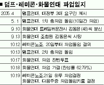 화물연대가 다음주중 전면파업에 돌입키로 했다. 레미콘 노동자들은 21일 하루 경고성 파업을 벌이기로 했다. 특히 지난 13일부터 파업에 들어간 덤프연대는 화물연대, 레미콘 노동자들과 공동 투쟁방침을 천명해 수출입화물과 건설현장에서 물류대란이 우려된다.