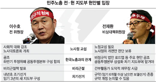 이 가운데 최고의 관심사는 비상대책위원장으로 선출된 전재환(45) 금속산업연맹위원장의 현 상황에 대한 관점이다. 비대위가 어떻게 굴러갈지를 가늠할 잣대이기 때문이다.