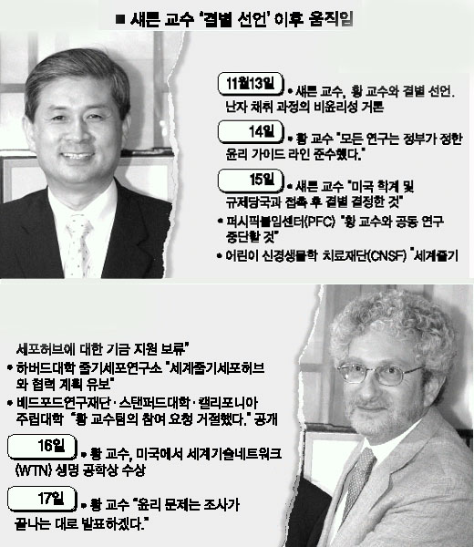 섀튼 교수는 지난 12일(현지시간) 워싱턴포스트와의 인터뷰에서 황 교수와 공동연구를 중단한다고 전격 발표했다. 그는 당초 황 교수팀이 추진 중인 ‘세계줄기세포허브’의 집행이사회 이사장을 맡기로 했었다.