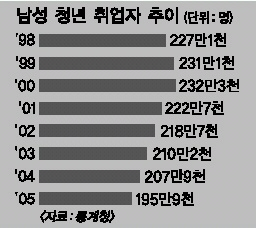 20대 남성 취업자를 연도별로 보면 10월 기준으로 1982년 245만 2000명에서 1991년 272만 8000명으로 최고를 기록한 뒤 1998년 227만 1000명으로 떨어졌다. 이어 1999년에는 231만 1000명,2000년 232만 3000명 등으로 회복됐다가 2001년 222만 7000명,2003년 210만 2000명 등으로 줄고 있다.20대 여성 취업자는 지난 10월 222만명으로 1년 전보다 0.4% 줄어드는데 그쳤다.
