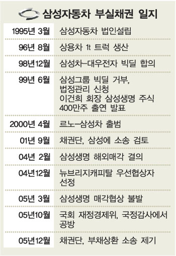 삼성차는 1995년 3월 법인이 설립됐으나 과잉투자에 따른 경영부실이 자동차산업 일원화 정책과 맞물려 외환위기 직후 매각이 추진됐다. 지난 99년 6월 대우전자와의 ‘빅딜’이 무산되자 법정관리를 신청하고, 금융권으로부터 2조 4500억원을 수혈받았다. 이때 이 회장은 대출금 상환조로 자신이 보유한 삼성생명 주식 350만주를 주당 70만원으로 산정해 무상증여 형식으로 채권단에 넘겼다. 당시 주식 가치는 삼성생명이 상장되는 것을 전제로 해 인정받았다. 요즘 삼성생명의 장외거래 가격은 35만원선이다. 이 회장은 나중에 주식 매각액이 2조 4500억원에 모자라면 50만주를 더 내놓기로 했다. 아울러 이 회장과 삼성전자 등 31개 계열사는 2000년 12월31일까지 대출금을 갚지 못하면 연체이자를 물겠다는 약정서를 작성했다. 그러나 삼성생명의 상장은 지금까지 이뤄지지 않고 있고, 채권단은 원금과 이자를 받지 못한 채 5년을 보냈다.