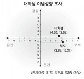가장 보수적인 쪽을 1, 가장 급진적인 쪽을 14로 놓았을 때 대학생들의 ‘급진·보수’ 지수는 4.65로 부모세대의 3.89와 큰 차이 없이 뚜렷한 보수성을 나타냈다. 이 교수는 “지수 8 이상이어야 급진으로 분류되는 것을 감안하면 현재 대학생들의 성향은 이에 크게 못 미친다.”고 말했다. 또 가장 보수적인 쪽을 7, 가장 급진적인 쪽을 21로 보았을 때 대학생은 13.52로 강경한 쪽에 위치했다. 반면 부모들은 15.22로 온건 성향이 더 강했다.14 미만은 강경,14 초과는 온건으로 본다.