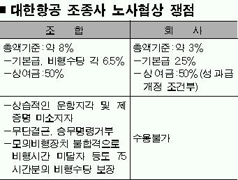 결국 ‘기본급과 비행수당 6.5% 인상·상여금 50% 인상’을 요구한 노조와 ‘기본급 2.5% 인상에 상여금 50%’을 고집한 회사측이 이견을 좁히지 못하고 8일 0시를 기해 파업에 돌입했다. 노사는 10월17일부터 50여일 동안 임금교섭을 진행했다. 이 과정에서 노조는 중앙노동위원회에 중재신청을 냈지만 조정안에 대해 노조 자신이 거부했다.