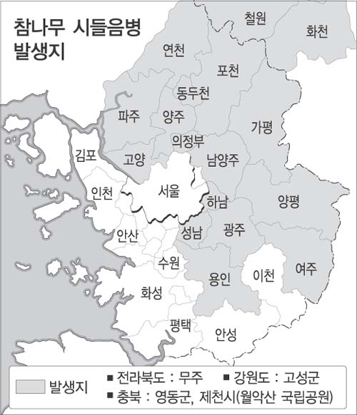 1988년 발생한 소나무재선충병이 1990년대 중반까지 해마다 100여그루씩의 피해만 낸 점을 감안할 때 참나무시들음병 확산속도는 발생초기 국면에서 훨씬 급격히 진행되고 있는 셈이다. 그럼에도 불구하고 현재 성남시 등 일부 지자체를 제외한 다른 대부분의 지자체에선 소나무재선충병 방제에 매달리느라 참나무 고사목이나 감염목 집계는커녕 발병 사실 여부조차 제대로 파악하지 못하고 있는 상태다.