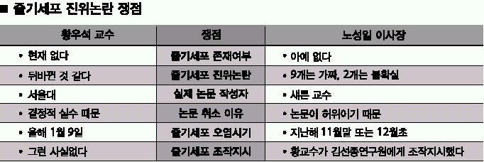 우선 줄기세포의 실제 존재 유무에 대해 황 교수는 배양에는 성공했으나 지금은 훼손되거나 뒤바뀐 것으로 추정돼 존재하지 않는다고 해명했다. 반면 노 이사장은 줄기세포가 애초부터 존재하지 않는 것이라고 주장했다.