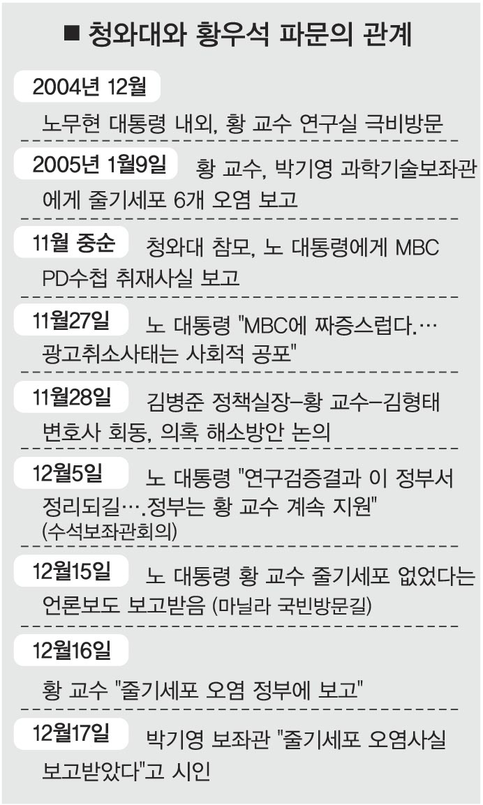 서울대 황우석 교수가 줄기세포의 오염사실을 통보한 정부 당국은 박기영 청와대 과학기술보좌관인 것으로 나타났다. 청와대 참모들은 줄기세포 연구의 결함을 알고도 노무현 대통령에게는 보고하지 않았으며, 일부에서는 청와대의 축소·은폐 의혹이 제기되고 있다. 이에 따라 한나라당은 노 대통령의 사과와 김병준 청와대 정책실장, 박기영 보좌관의 파면을 요구하고 나서면서 ‘황 교수 파문’은 청와대와 정치권으로 확산되는 조짐이다.