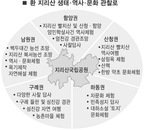백두대간 중심축이자 국립공원 제1호인 지리산을 조망할 수 있는 ‘환 지리산 생태·문화·역사 관찰로’가 조성된다. 이는 등산에 대한 패러다임을 바꿔 새로운 등산문화 창출을 위한 첫 시도여서 눈길을 끈다. 20일 산림청에 따르면 내년 상반기 선보일 ‘환 지리산’는 산책과 생태·문화탐방을 결합시킨 산림 휴양프로그램으로 선보인다. 무의미한 산행보다 자연에 숨겨진 문화유산과 삶의 이야기를 알고, 자연스럽게 보존 가치를 깨닫게 한다는 취지를 담고 있다.
