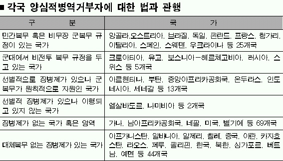 인권위는 나아가 “현재의 제도는 ‘양심적 병역거부 및 형사처벌’과 ‘단순한 병역이행’ 가운데 하나를 선택하도록 하고 있다.”고 전제,“헌법 19조의 ‘양심의 자유’와 39조 ‘국방의 의무’가 조화롭게 공존할 수 있는 방법으로는 대체복무가 있다.”며 도입을 권고했다.