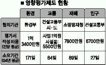 건당 평균 7800만원이 드는 재해영향평가 역시 시공계획이 확정된 후에나 평가할 수 있는 토사유출량이나 사면안정성 여부를 예측하도록 해 실질적 효과가 거의 없는 것으로 평가됐다. 오히려 재정적 낭비를 초래하고 있어 국제전시장 건립을 추진한 경기도 고양시의 경우, 재해영향평가로 인해 불필요한 저류지 설치에 47억여원을 쏟아부어야 했다. 교통영향평가도 마찬가지다. 최고 1억원 이상 투자되지만 교통영향평가서 상의 개별대책을 실제 적용하는 것은 사실상 불가능하다.