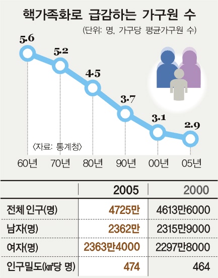 핵가족화 영향으로 평균 가구원 수가 사상 처음으로 3명 미만으로 떨어졌다.‘4인 가족’은 옛말이고 ‘3인 가족’에서 다시 ‘2인 가족’으로 치닫는 추세다.