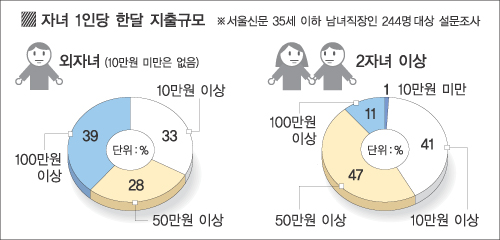 서울신문이 지난달 서울·수도권 거주 35세 미만 기혼 남녀 직장인 244명을 대상으로 한 설문조사를 한 결과, 자녀가 한명인 사람의 38.8%는 아이 양육비로 100만원 이상을 쓰는 것으로 나타났다.