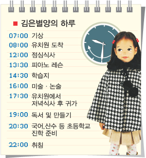 평일에는 바이올린, 피아노, 영어는 물론 종이접기 학원까지 하루에 3∼4곳의 학원을 다녀야 했다. 주말에는 엄마와 함께 재즈댄스, 붓글씨 등을 배우러 다녔다.