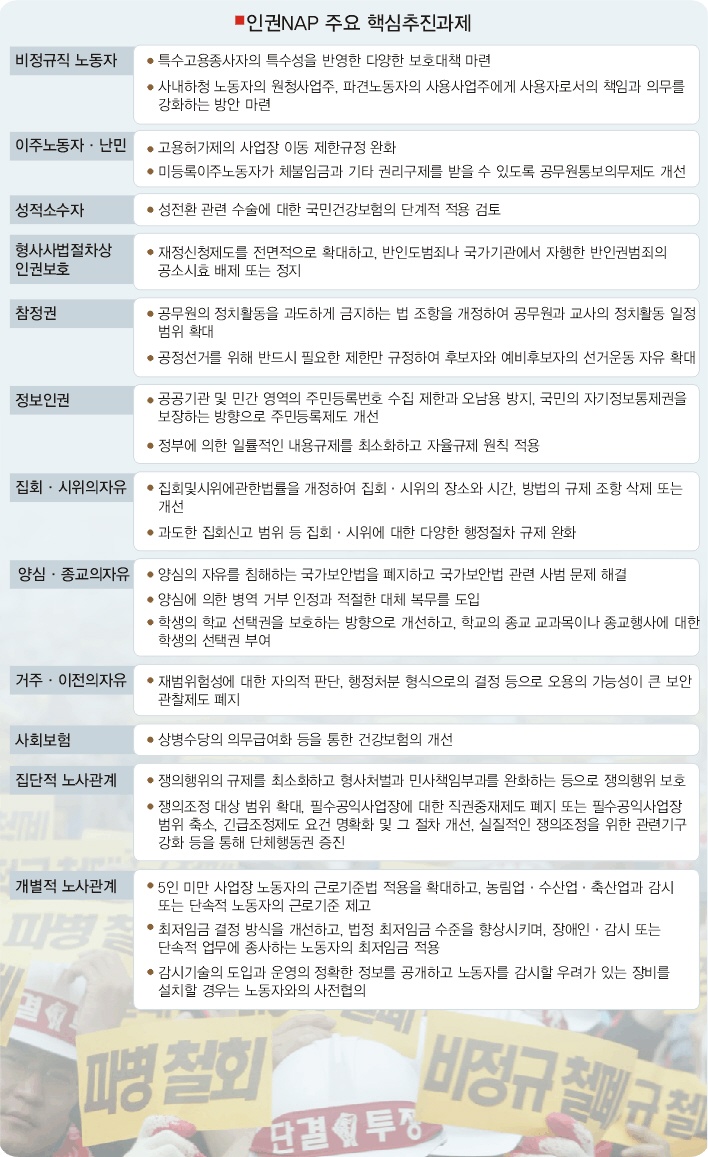 국가인권위원회가 9일 확정 발표한 ‘국가인권정책기본계획’(인권 NAP) 권고안은 대체복무제 도입 등 논란이 되고 있는 현안들을 담고 있으며 대체로 ‘진보적 색채’를 띠고 있다.