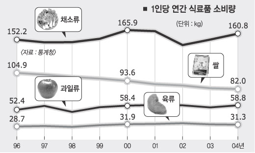 양곡류 외에 육류 소비량도 2004년 31.3㎏으로 전년보다 1.3% 줄어든 것으로 나타났다. 반면 과일류 소비량은 2004년 58.8㎏으로 전년보다 5.4% 증가했고, 채소류도 같은 기간 소비가 5.5% 늘었다.
