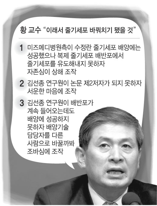 황 교수는 우선 논문 조작에 대해 “2004년 논문의 1번 줄기세포는 미즈메디 병원 박종혁 연구원이,2005년 논문의 2,3번 줄기세포는 김선종 연구원이 각각 체세포와 DNA지문을 비교 분석하고 일치한다는 자료를 줬고, 이를 다시 검증하지 않고 믿었다.”면서 “이들은 서울대 조사위에서도 같은 내용을 진술한 것으로 안다.”고 말했다. 김 연구원 등이 의도적으로 황 교수를 속였다는 것이다.