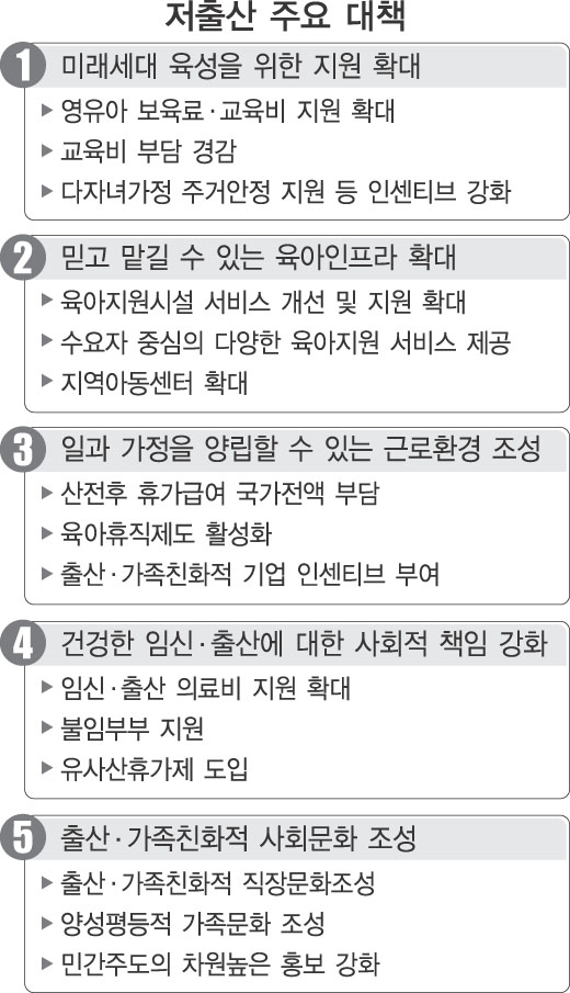 OECD국가 중 가장 낮은 수준으로 떨어진 출산율을 높이기 위한 종합 대책이 마련됐다. 정부가 확정한 저출산 대책은 ‘미래세대 육성을 위한 지원 확대’ 등 5개 분야로 나뉘어져 추진된다.