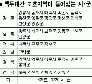 산림청은 백두대간보호에 관한 법률이 지난해 시행됨에 따라 보전·관리 및 이용 방향을 제시한 ‘백두대간보호 기본계획’을 20일 발표했다. 대상지역은 지난해 지정된 보호지역 26만㏊와 새로 추가한 인접지역 14만㏊ 등 모두 40만㏊이다.