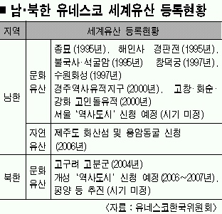 유네스코 한국위원회 관계자는 “북한은 선죽교·공민왕릉 등을 묶어 개성의 등록을 추진하고 있다.”면서 “등록마감인 오는 2월1일까지 북한이 등재 신청을 할지 주목하고 있다.”고 밝혔다. 유네스코는 매년 2월까지 등록 신청을 받으면 이듬해 6월 총회에서 등록 가부를 결정한다. 이 관계자는 “2004년 7월 총회에서 평양에 있는 고구려 고분군이 유네스코 문화유산으로 등록되면서 평양을 역사도시로 등록하는 방안도 추진 중”이라고 말했다. 특히 서울을 역사도시로 등재하려는 한국이 지난해 10월 유네스코 총회에서 이사국으로 뽑힘에 따라 남북 세계유산 등록 활동에 더욱 박차를 가할 수 있을 것으로 전망된다.