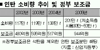 연탄 소비가 늘면서 정부의 보조금 부담도 늘고 있다. 정부는 저소득층을 고려해 석탄을 캐서 연탄을 제조하는 데 지난해에 2400억원의 예산(탄가안정대책비)을 투입했고 올해도 2556억원의 예산을 책정, 이미 506억원을 집행했다.