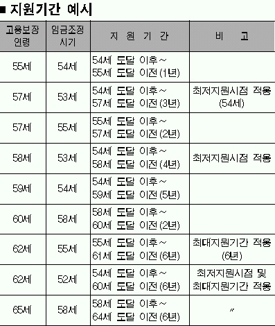 지원기간은 55세 정년을 보장할 경우 1년,56세 2년,57세 3년 등 60세까지 최대 6년간 지원된다.