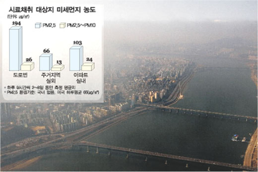 PM2.5란 굵기가 100만분의2.5m 이하의 미세먼지를 뜻한다. 미세먼지는 ▲서울 도심의 교통혼잡지역 ▲이웃한 주거지역의 실외 ▲이 지역 아파트의 실내에서 모았다.