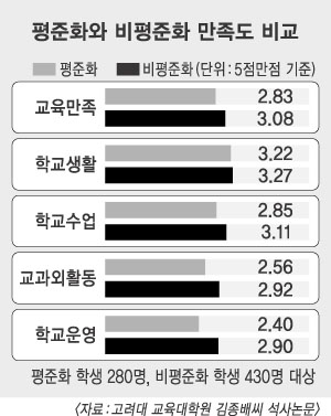 설문은 학교생활·학교수업·교과외활동·학교운영 등 4부문으로 나눠 실시됐다. 각 부문에서 모두 비평준화 지역 고교생의 만족도가 더 높았다.