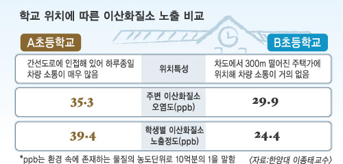 한양대 보건대학원 이종태 교수는 서울 성동구에 있는 A초등학교와 B초등학교 학생 각각 27명과 33명을 대상으로 24시간 동안 이산화질소 노출농도를 측정한 결과, 각각 평균 39.4ppb와 24.4ppb로 큰 차이를 보였다고 6일 밝혔다.