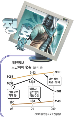 개인 정보 도난 사건은 해마다 늘고 있다. 한국정보보호진흥원에 따르면 지난해 개인정보 침해신고 건수는 모두 1만 8206건으로 2004년보다 640여건 늘었으며, 올 1월에만 2131건이 추가로 신고됐다. 이 가운데 ‘주민등록번호 도용 등 타인 정보의 훼손·침해·도용사례’가 54%(9810건)로 절반을 넘었다.‘이용자 동의 없는 개인정보 수집’도 1140건으로 전년(564건)보다 102.1%나 증가했다.