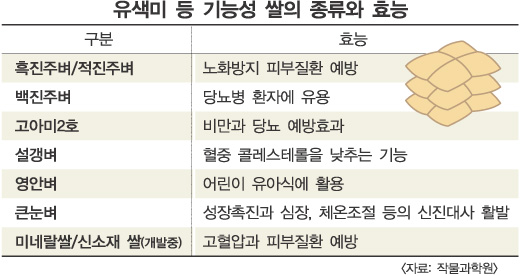 작물과학원의 연구 대상은 ‘단 맛’뿐이 아니다. 일반 쌀보다 2∼3배 큰 ‘슈퍼 쌀’에서 영양분이 듬뿍 담겨 이유식에 활용될 ‘거대 배아벼’ 등 수두룩하다. 이 중에서도 최근 관심을 많이 끄는 것은 질병을 예방하는 건강식과 관련된 기능성 쌀이다. 특히 유색미에 포함된 색소의 성분을 분석, 고혈압과 같은 각종 성인병과 아토피성 피부질환을 겨낭한 ‘건강 맞춤형’ 쌀에 대한 연구에 집중되고 있다.