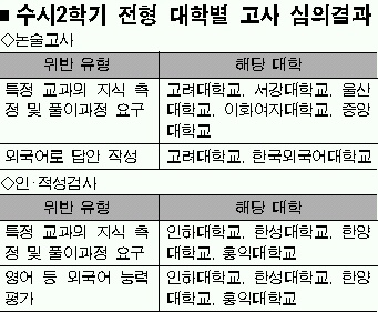 인·적성 검사를 단순 자격기준으로 활용하지 않고 점수화해 전형에 반영한 대학 가운데 본고사형 문제를 낸 대학도 이번 심의에서 적발됐다.