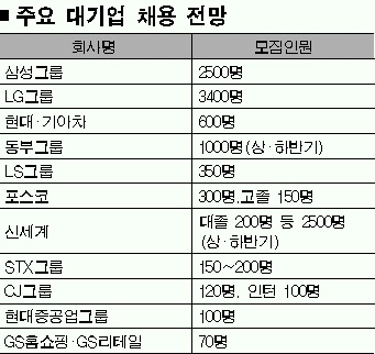 삼성그룹은 상반기에 대졸 수준의 3급을 2500명 뽑을 예정이고 LG그룹은 전자부문 2600여명, 화학부문 400여명, 통신·서비스부문 400여명 등 3400여명을 채용한다.