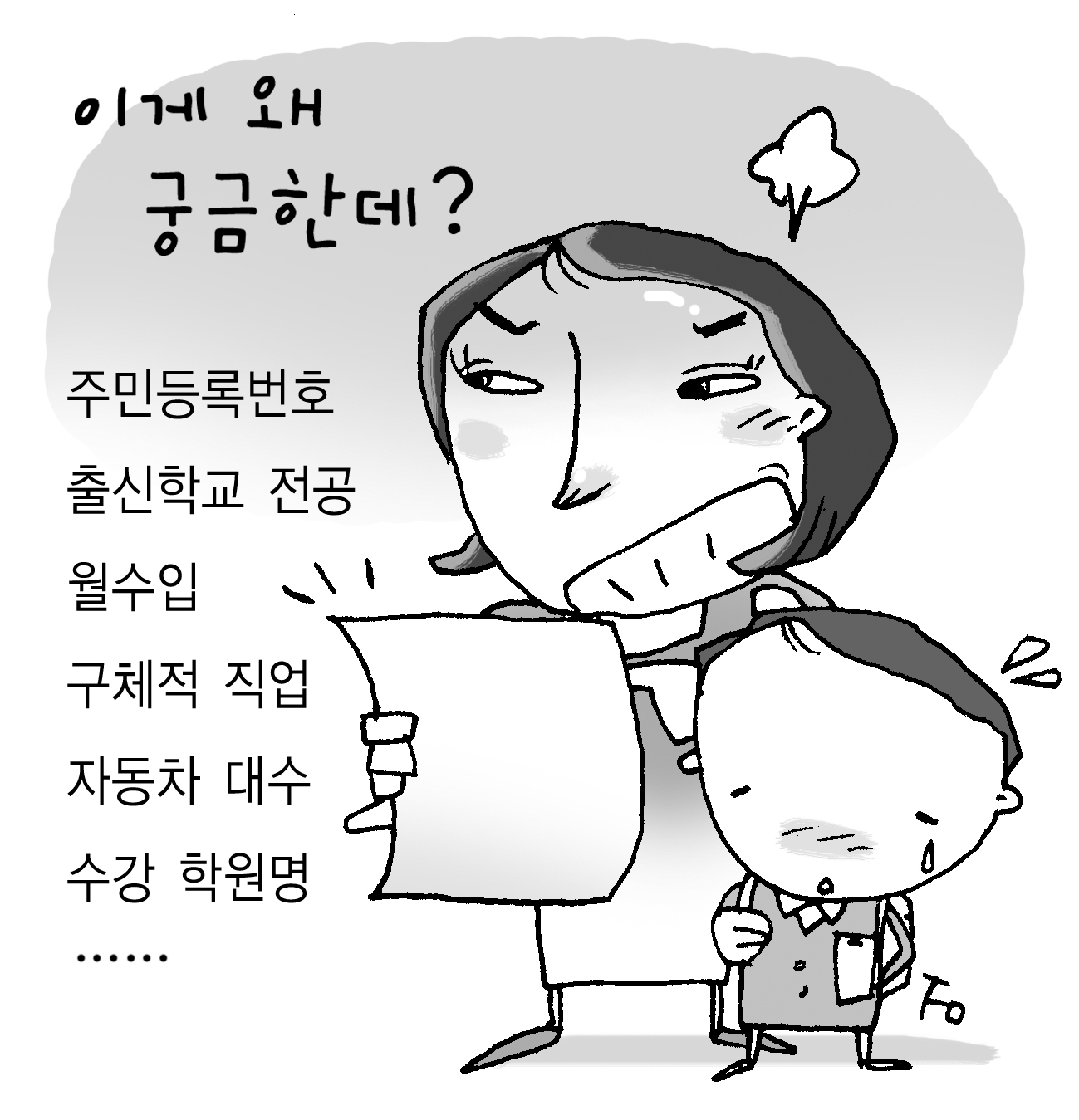 교육부는 부모의 학력, 직업, 수입 등 항목을 빼라고 했지만 상당수 일선 학교에서는 여전히 꼬치꼬치 캐묻고 있다. 부모들은 불쾌감에 더해 아이들 사이에 위화감이 생길 것이라고 걱정하지만 교육부는 학교장 권한이어서 어쩔 수가 없다는 입장이다.