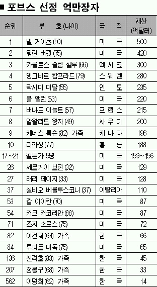 세계 최고 부자는 역시 빌 게이츠(50) 마이크로소프트 회장.12년째 1위를 지킨 게이츠 회장은 지난 한해 동안만 무려 35억달러(약 3조 5000억원)를 불렸다. 그의 재산은 500억달러(약 50조원)로 조사됐다. 지난해 122위였던 이 회장과 가족들의 재산은 한해 동안 22억달러(약 2조 2000억원)가 불어난 66억달러(약 6조 6000억원)였다.