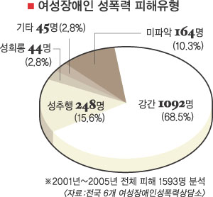 지난해 전국 6개 여성장애인 성폭력 상담소에 접수된 피해사례가 총 479건으로 2001년의 2.5배에 육박한 가운데 집단 성폭력이 급증세에 있는 것으로 밝혀졌다. 성폭행 가해자가 2명에서 10명 사이인 사례는 2001년 전체 피해자 200명 중 13.0%인 26명이었지만 지난해에는 전체 479명 중 19.6%인 94건으로 증가했다. 특히 6∼10명이나 되는 여러 가해자로부터 폭력을 당한 여성장애인도 45명으로 전체의 9.4%를 차지했다.2001년에는 6∼10명 가해사례가 단 1건에 불과했다.