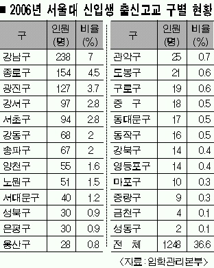 2006년 서울대 신입생 가운데 강남구에 있는 고등학교를 졸업한 학생이 가장 많은 것으로 나타났다.
