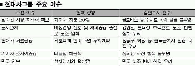 현대차그룹에 떨어진 ‘발등의 불’은 정몽구 회장 부자의 출국금지 여부. 만약 출금이 단행되면 오너가 직접 경영을 챙기는 현대차그룹 스타일상 직격탄을 맞게 된다.