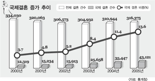 30일 통계청의 ‘2005년 혼인·이혼통계 결과’에 따르면 지난해 외국인과의 결혼은 4만 3121건으로 전년 3만 5447건에 비해 7674건(21.6%) 늘었다. 지난해 전체 결혼 건수 31만 6375건(전년 대비 1.7% 증가)의 13.6%다.