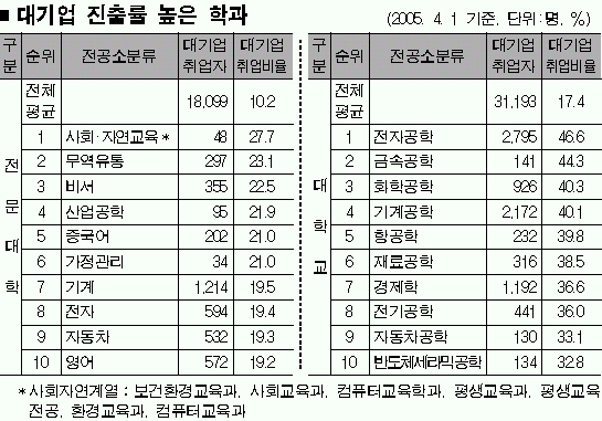 대기업 진출 비율이 높은 상위 10개 전문대학 전공은 사회ㆍ자연교육(27.7% 보건환경교육과, 사회교육과, 컴퓨터교육학과, 평생교육과 등), 무역 유통(23.1%), 비서(22.5%), 산업공학(21.9%), 중국어(21%), 가정관리(21%), 기계(19.5%), 전자(19.4%), 자동차(19.3%), 영어(19.2%)로 집계됐다.